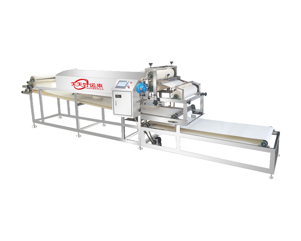 數(shù)控雙層冷卻涼皮機系全自動型,將面漿、米漿、淀粉漿等原料加入漿桶后,可以自動上漿,可生產(chǎn):折疊張、切條等形狀的制品,如涼皮、米皮、河粉、粉皮、米粉、大拉皮等。有時產(chǎn)200-3000斤涼皮(蒸箱長度2-15米)多種型號大小的涼皮機供您選擇。本機機身及箱體采用優(yōu)質(zhì)不銹鋼制造,變頻控制、特氟龍布帶、自動糾偏、自動刷油、雙層傳送冷卻等操作簡便,標配電加熱,機器留有蒸氣管道,可以外接發(fā)蒸汽鍋爐等。機器切斷功能為單選產(chǎn)品,需要另購買。